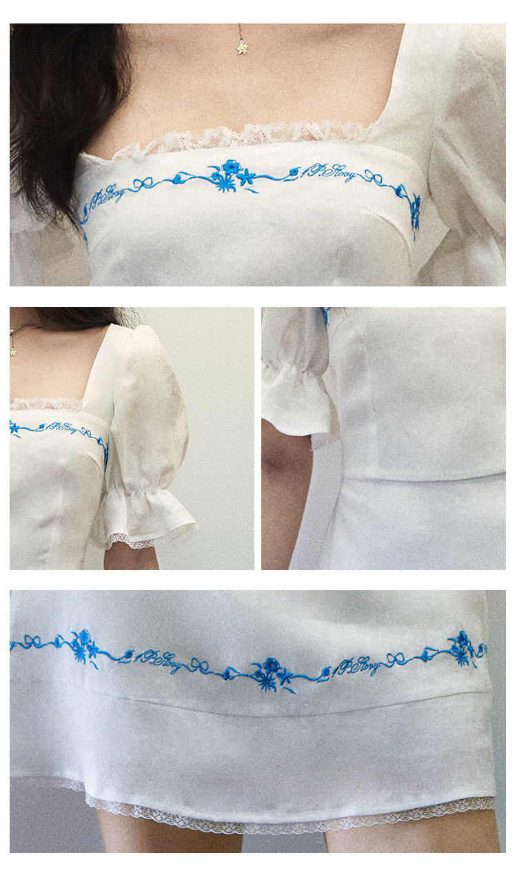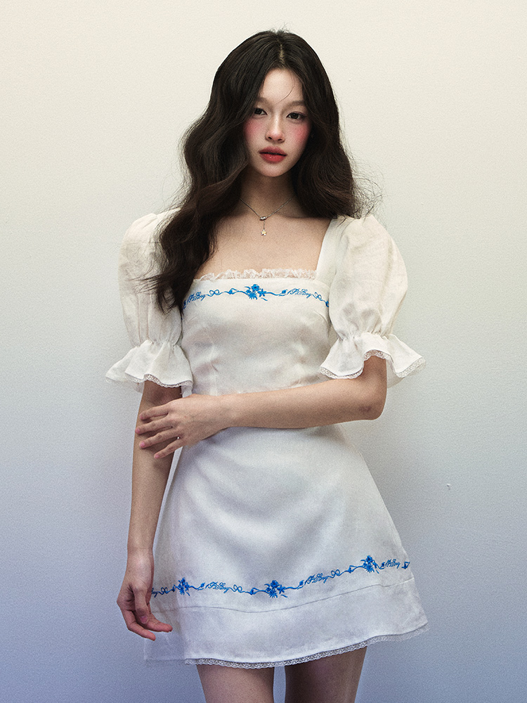 Women's Summer Blue Embroidered Horn Short Sleeve White Linen Generous Neck Dress
